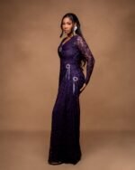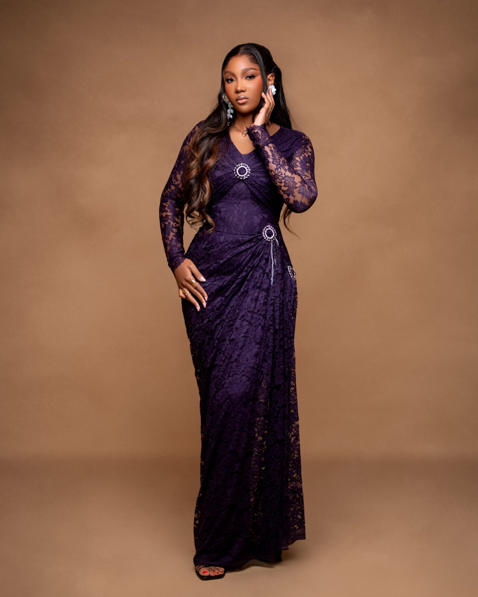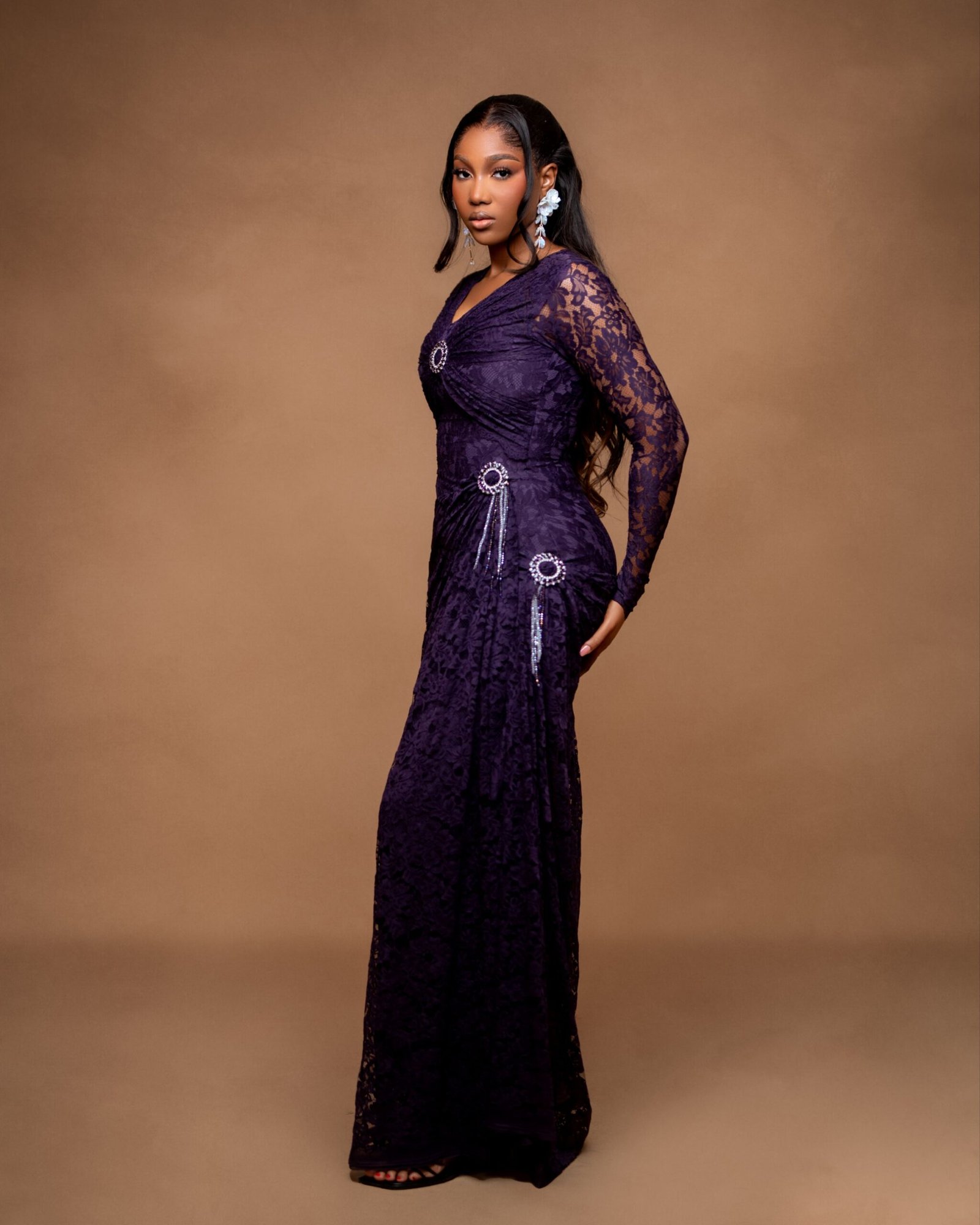 Crafted from delicate chantilly lace and adorned with a statement embellished buckle, the Candid Dress drapes the body with grace and understated drama. A gentle tassel detail adds movement — every step tells a story.