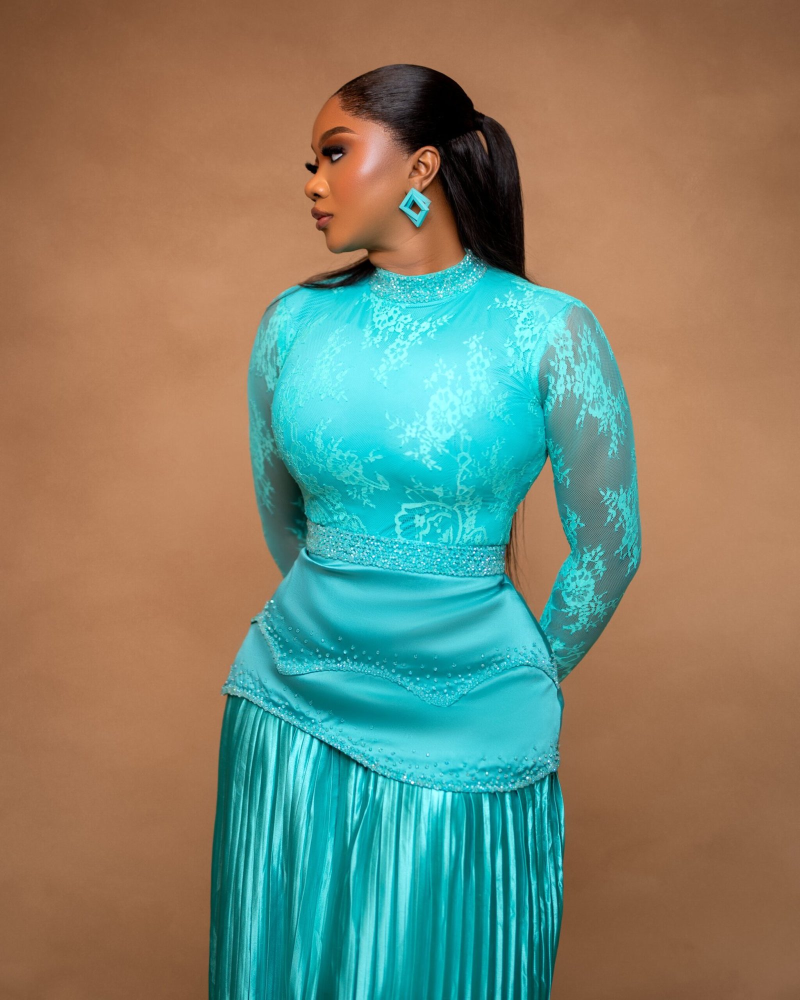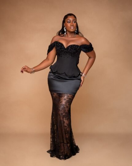 The Gemini Set is where grace meets structure — featuring a luxe beaded chantilly lace top paired with a sculpted mikado waistline and flowing pleated satin skirt. A timeless silhouette for the woman who’s both soft and commanding.
